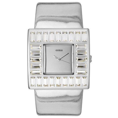 * All Stainless Steel Case & Buckle * Trendy Silver Genuine Leather Shiny Band * Analog with Silver Hands * Stylish Square Silver Face w/ Sparkling Crystal Bezel * Silver Second Hand * Precision Japan Quartz Movement * Quality Parts * Water Resistant * Domed Scratch Resistant Mineral Crystal * Guaranteed 100% Authentic Guess Watch ****Watch Stats**** [FACE] * Style: Analog * Shape: Square * Size: 1-1/2 * Color: Silver * Hands: Silver * Hour Markers: None * Misc: Silver Second Hand [BAND] * Material: Genuine Leather * WristSize: 6-1/4" to 8" * Width: 1-1/4" * Color: Silver * Clasp: Buckle * Misc: "